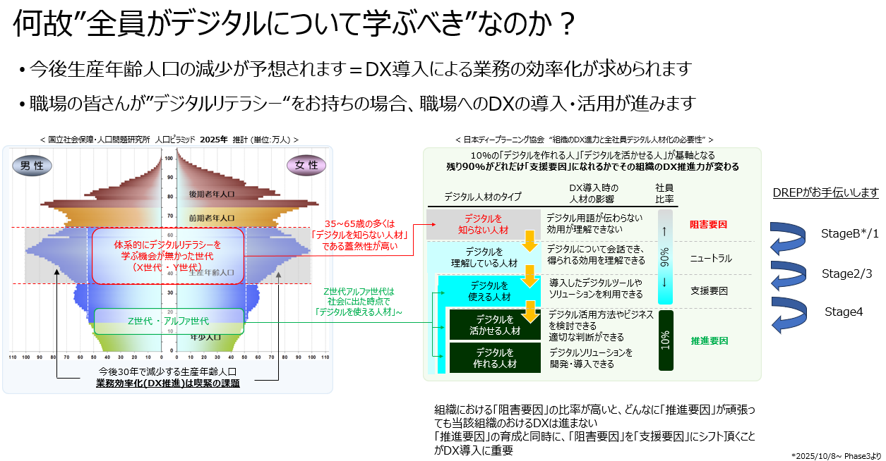 - 少子高齢化社会がもたらす労働力減少が間近に迫っており、デジタル技術の導入・活用による業務の効率化・新しいモデルの導入は待ったなしの状況となりつつあります。デジタル技術の導入・活用により職場を変えていくためには、職場の皆様一人一人の「デジタルに関する理解」が欠かせません。職場の皆様がDX(Digital Transformation)を導入・活用するために必要な知識を習得できるようDREPがサポートいたします。