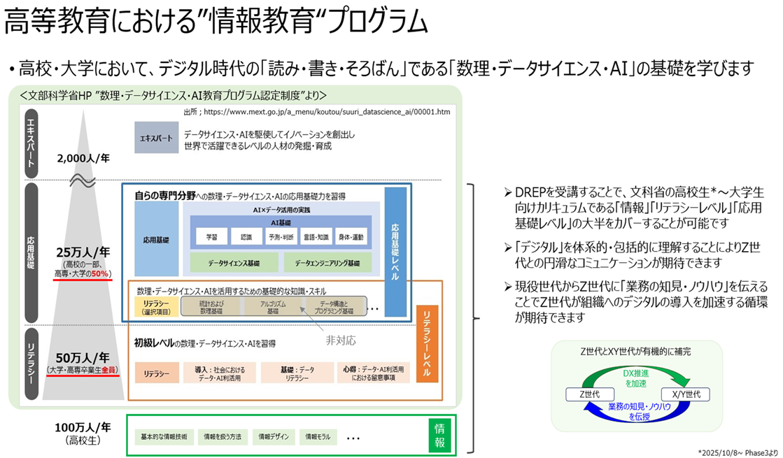 - これから職場の戦力となるZ世代(デジタルネイティブ)がその”デジタル力”を存分に発揮するには、職場の皆様による理解と協力が欠かせません。職場の皆様がZ世代を理解するために「Z世代が高校・大学で学んだデジタルの知識*」と同等の知識を習得できるようDREPがサポートいたします。